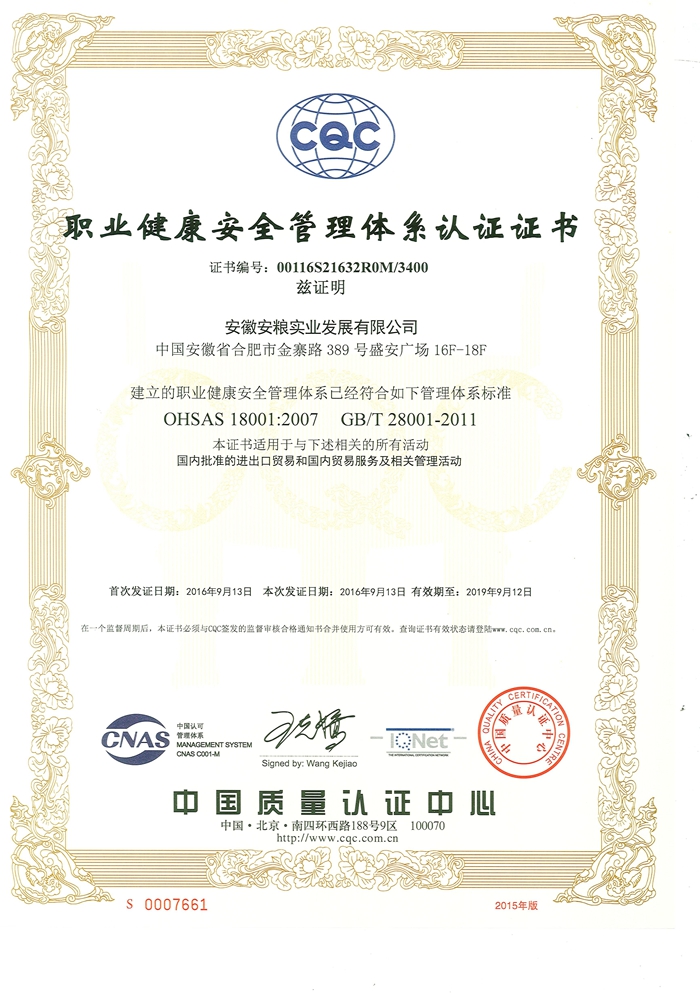 近期,安糧實業順利通過中國質量認證中心審核,在ISO9001認證的基礎上又取得了ISO14001環境管理體系和OHSAS18001職業健康安全管理體系認證證書。證書的獲得標志著安糧實業建立了完整國際化管理體系,實現了ISO9001、ISO14001和OHSAS18001三個體系并行運轉,必將促進公司生產經營活動更上一個臺階。