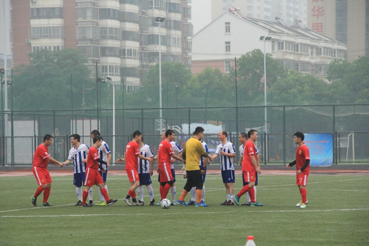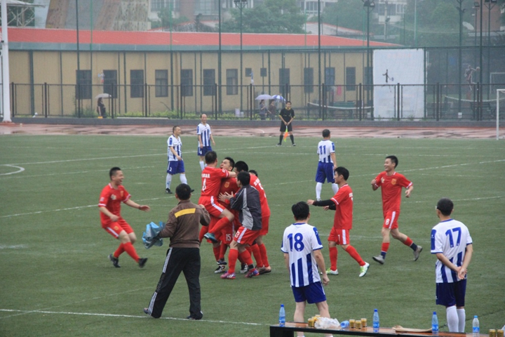 比賽開場不久,惡劣的天氣和球員的狀態不佳就讓我方遭到了懲罰,對方遠射,門將李釗不敢怠慢,奮力撲出第一點,無奈對方前鋒跟進補射得分。此后我方便開始奮力反撲,但始終不能攻破對手城池。第二節,國貿聯隊的經驗優勢得以凸顯,他們站樁式的防守和不緊不慢的傳控,導致我方很長一段時間無法組織有效的進攻,加上我方隊員急躁的情緒,場面一度失控。休息時間全隊聚集討論,決定奮力一搏,隊長方波帶傷上陣,加強進攻。人員調整后,我方士氣明顯提升,經過幾輪的組織,終于由徐學峰右路突破下底傳中,前點潘永博巧妙一漏,侯立峰左腳冷靜推射破門。一鼓作氣,方波角球精確助攻,對方中后衛冒頂,侯立峰后點頭球再下一城。緊接著潘永博突破打門,對方門將脫手,方波跟進冒著左腿再次拉傷的危險,奮力將球打進,3:1鎖定勝局,全體隊員緊緊的擁抱在一起,場下啦啦隊也情緒高漲,擊鼓吶喊為安糧健兒加油。