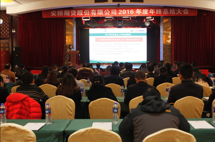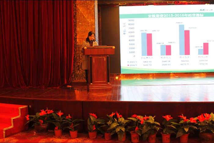 隨后,安糧期貨總經理余萍作公司2016年度工作總結報告。余總回顧了2016年全國期貨市場情況,結合公司各項經營指標進行深入解讀,對過去一年的重點工作完成情況進行了總結,介紹了2016年公司經營成果及榮獲獎項,并分析存在的問題。余總指出,2016年公司取得了良好的經營成果,這是全體員工共同努力的結果。新的一年,公司將繼續奮發進取,攻堅克難,實現公司跨越式發展。
