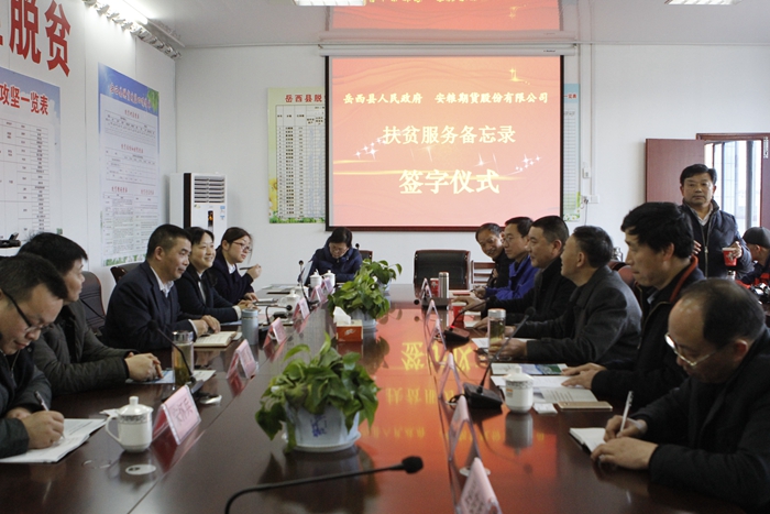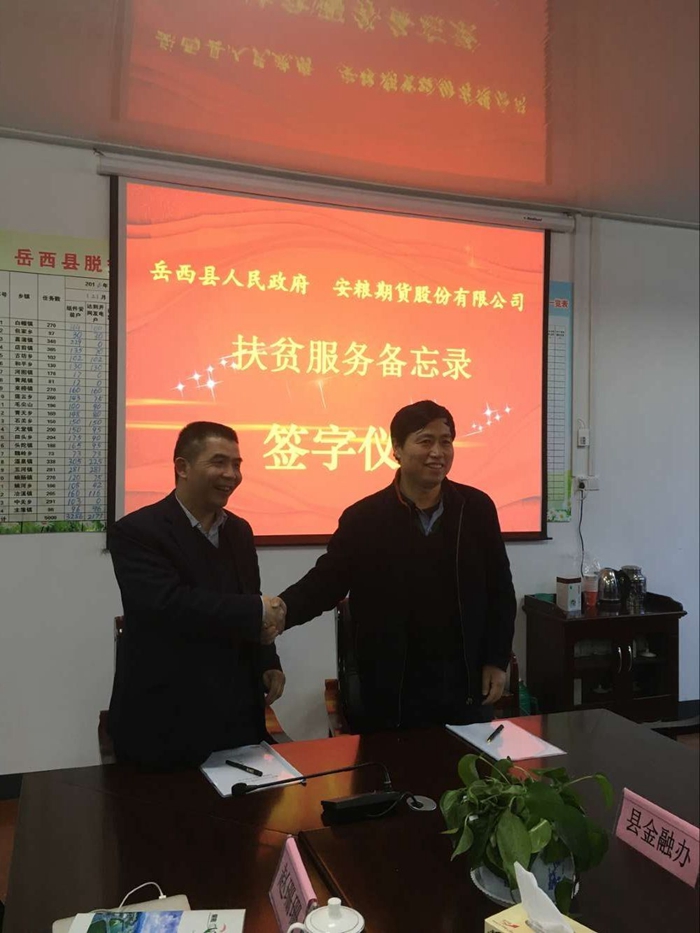 2017年3月22日,安糧期貨董事長朱中文、總經理余萍一行前往岳西縣與當地政府簽訂了《扶貧服務備忘錄》。簽約儀式在岳西縣扶貧辦舉行,岳西縣委副書記徐昭,副縣長孫斌出席會議并發言,副縣長方紹武主持會議,縣金融辦、縣扶貧辦、縣農委等相關領導出席了此次簽約儀式。