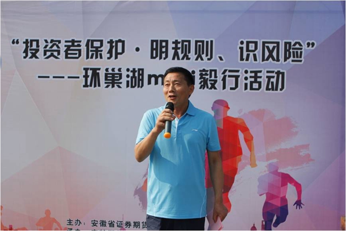 上午八點二十,濱湖新天地廣場上人頭攢動、旌旗招展,參加此次活動的全體員工在這里集合完畢。活動開始前,安徽省證券期貨業協會副會長、秘書長鐘自木代表協會致辭。