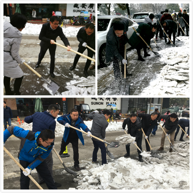 連日的大雪給合肥帶來了銀光素裹的美景,同時也造成道路積雪成冰,濕滑難行,給市民出行帶來諸多安全隱患。2018年1月29日上午,安糧實業黨支部18名共產黨員戴上手套扛著鐵鍬,走上金寨路與廻龍橋路交口附近人行道開展鏟雪除冰活動。