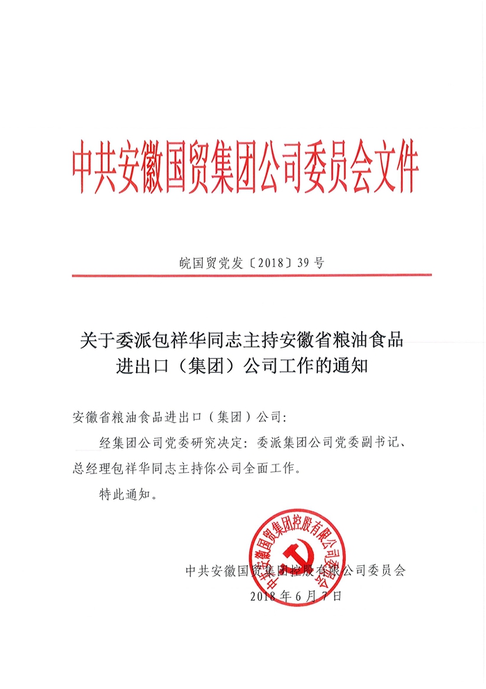 按照會議安排,首先由李明輝同志受國貿集團黨委委托宣讀《關于委派包祥華同志主持安徽省糧油食品進出口(集團)公司工作的通知》,包祥華同志、范陽同志先后講話。