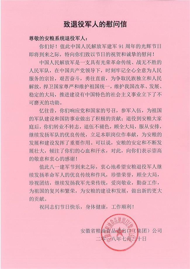 中國人民解放軍建軍91周年節日前夕,根據集團黨委的部署,集團工會慰問了安糧系統全體退役軍人,向他們送上節日的問候和美好的祝愿!