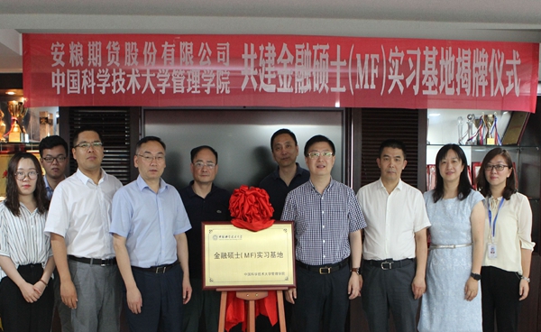 7月5日上午10點,安糧期貨股份有限公司與中國科學技術大學管理學院共建金融碩士(MF)實習基地揭牌儀式在公司總部11樓會議室隆重舉行,中國科學技術大學管理學院副院長胡太忠、金融碩士教育中心主任郭新帥一行,與安糧期貨董事長汪勇,副董事長、總經理朱中文及部分公司領導、部門負責人共同出席了揭牌儀式,儀式由安糧期貨常務副總經理余萍主持。