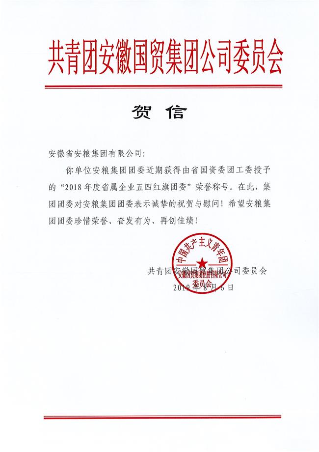 8月6日,國貿集團團委發來賀信,安糧集團團委近期再獲殊榮——在省國資委團工委開展的“兩紅兩優”評選中被授予“2018年度省屬企業五四紅旗團委”榮譽稱號。
