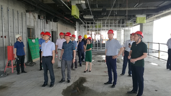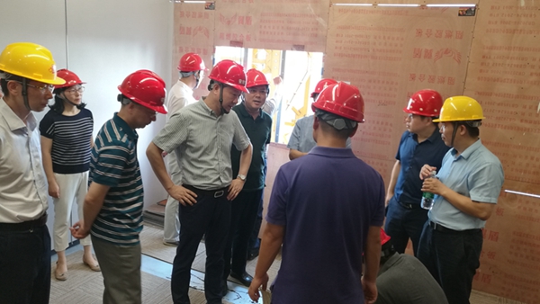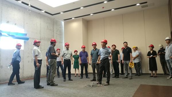 曹訓立董事長一行來到精裝修樣板層,參觀了獨立式辦公室、開放式辦公區、會議室等主要區域,對空調系統、電梯設備、墻地面裝飾材料等進行了細致了解,并對會議中心提出了具體要求。