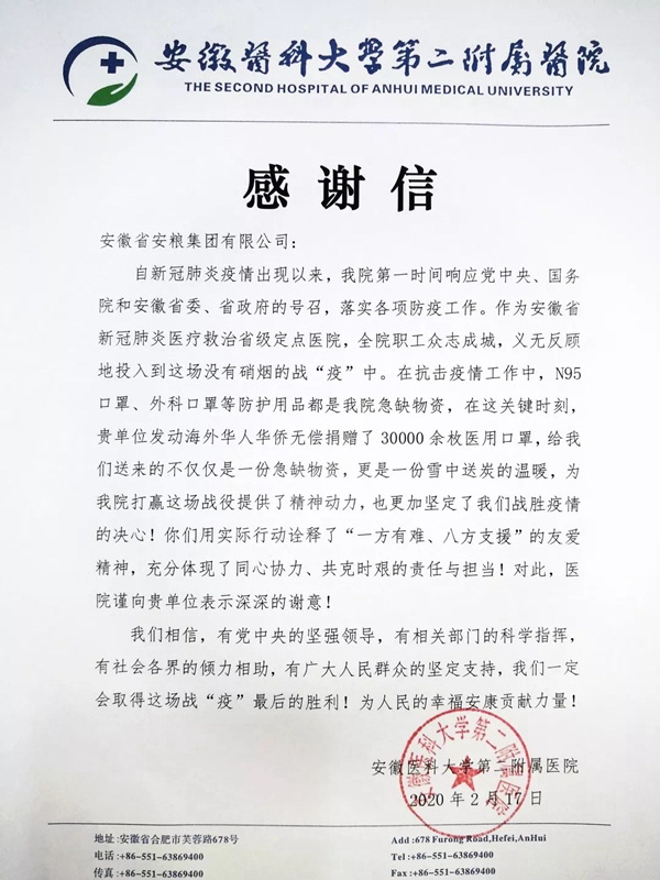 在現場捐贈3萬只口罩給安醫二附院后,第二天上午,國貿集團向省紅十字會捐贈了10萬只口罩,有力地支援了安徽的防控戰“疫”。剩余的口罩也及時發放到國貿集團和安糧集團所屬企業,為各家企業的復工復產提供了有力保障。
