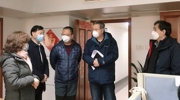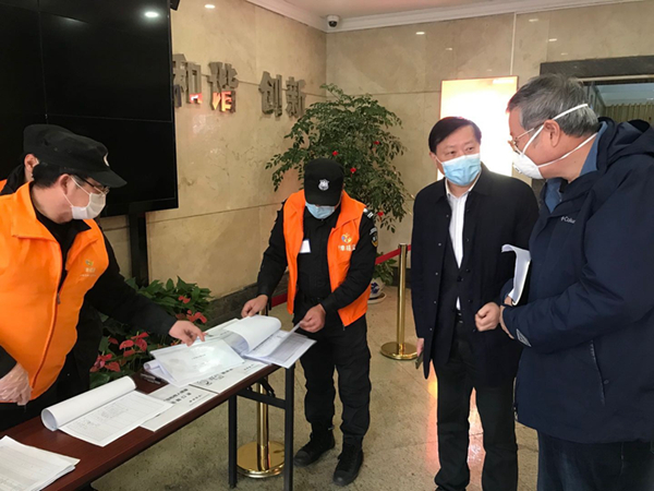 在盛安廣場一樓大廳,包總一行主動接受體溫測量和登記,現場檢查了測溫、消毒及人員進出登記工作,聽取了現場工作人員的情況匯報,對他們的辛勤工作表示慰問和感謝,充分肯定了公司疫情防控工作。