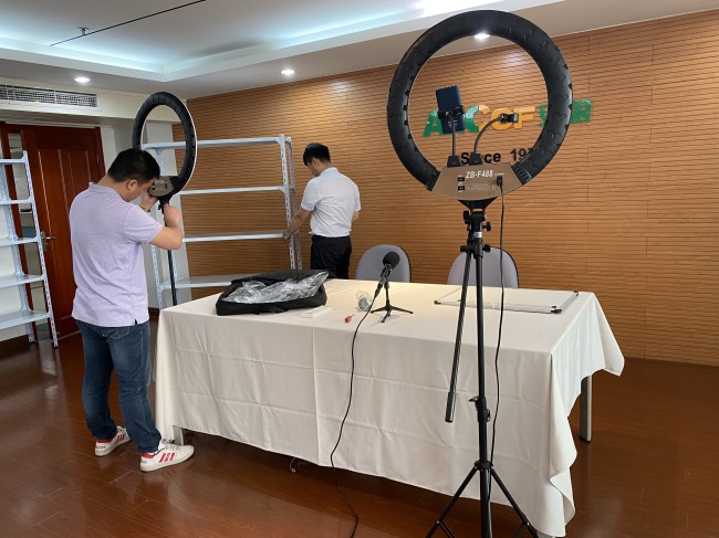 為全力保障網上直播所需的硬件設施,公司針對各參展部門特點,利用有限的辦公場所布局了“1+3+3”式直播間陣型,既1個“主直播間”、3個“普通直播間”和3個“駐外直播間”(深圳南方公司2個、紹興柯橋1個)。其中,主直播間主要用于參展部門在本屆廣交會的主打商品和新品宣傳發布,聘請專業公司予以相關硬件和技術支持;普通直播間和駐外直播間主要用于各參展部門開展期間自行直播互動,由公司統一提供硬件設備支持。