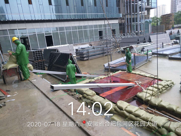 針對(duì)入梅以來(lái)嚴(yán)峻的防汛形勢(shì),已交付及在運(yùn)營(yíng)項(xiàng)目積極協(xié)調(diào)物業(yè)公司,共同迎戰(zhàn)強(qiáng)降水天氣。位于合作化路和南二環(huán)交口的安糧國(guó)貿(mào)中心是此次防汛形勢(shì)較嚴(yán)峻的重點(diǎn)項(xiàng)目,特別是降雨量突破合肥市歷史極值的7月18至19日,積水內(nèi)澇直接影響到地下室的安全。險(xiǎn)情出現(xiàn)時(shí),一線人員及時(shí)匯報(bào),各崗位人員在半個(gè)小時(shí)內(nèi)到崗參與排險(xiǎn)工作。項(xiàng)目部對(duì)地庫(kù)出入口等易形成倒灌水的危險(xiǎn)區(qū)域安排工作人員堆砌沙袋,打開集水井蓋板,保證積水最大流量的排放。同時(shí)配合唯品會(huì)工作人員啟動(dòng)區(qū)域排水泵,對(duì)易積水難排水區(qū)域進(jìn)行再清理再疏通,隨著南二環(huán)和合作化路積水水位逐漸下降,安糧國(guó)貿(mào)中心順利通過(guò)了此次防汛考驗(yàn)。