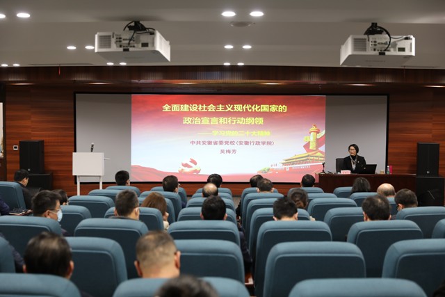 吳教授以《全面建設社會主義現代化國家的政治宣言和行動綱領——學習黨的二十大精神》為主題展開宣講,她介紹了黨的二十大召開的特殊背景和重大意義,從黨的二十大的主題和主要成果、黨的二十大報告的基本內容和核心要義、學習宣傳貫徹黨的二十大精神三個方面,深入淺出、融會貫通地分析了本次會議提出的各項突破、首次創新以及細微變化背后的深刻含義,為抓好黨的二十大精神的大學習、大宣傳、大貫徹工作指明了方向、提供了思路。