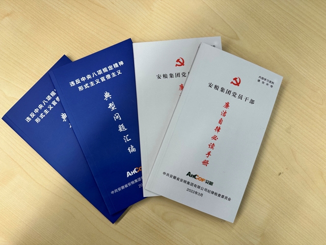 會議還給每位新任職干部發放了《安糧集團黨員干部廉潔從業必讀手冊》和《違反中央八項規定精神形式主義官僚主義典型問題匯編》。