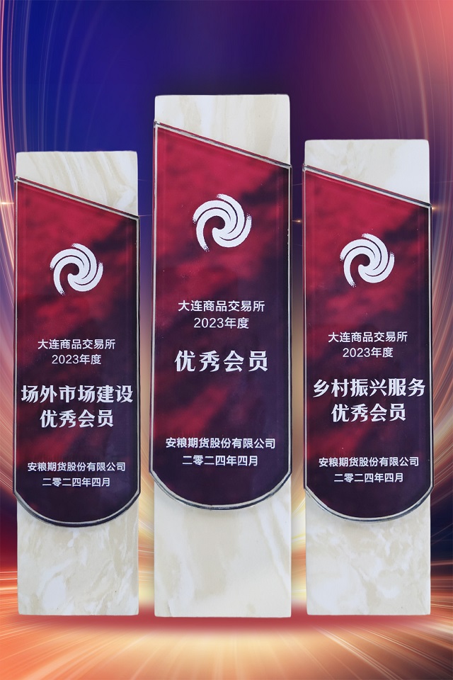 2024年4月8日,安糧期貨在大連商品交易所2023年度優秀會員表彰中榮獲“優秀會員”、“場外市場建設優秀會員”、“鄉村振興服務優秀會員”三項殊榮。