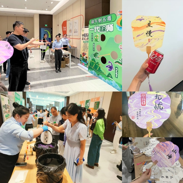 5月29日,在公司餐廳開展的“仲夏奔赴?美味出粽”端午趣味活動,吸引了眾多員工熱情參與。活動現場最具人氣的“端午射五毒”游戲,參與者手持弓箭瞄準背景板上的蛇、蝎等“五毒”圖案,在體驗傳統民俗競技樂趣的同時,寄托驅邪避毒、祈福安康的心愿。同步開展的非遺漆扇制作活動讓員工通過親手創作進一步深化對非遺文化的認知。成品扇子上,“山海”“無憂”“且慢”等字樣與端午元素、傳統書法相映成趣。
