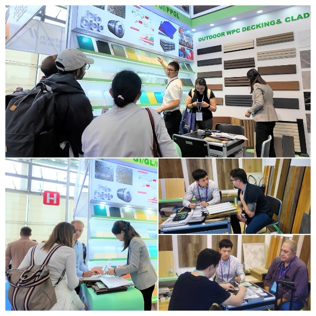 在建材展區(qū),同樣亮點(diǎn)紛呈。安糧以“適配性”和“實(shí)用性”贏得客戶(hù)認(rèn)可。展區(qū)重點(diǎn)展示的室內(nèi)地板、墻板及格柵等產(chǎn)品,可實(shí)現(xiàn)“墻地一體化”裝修,為客戶(hù)提供高效、整體的空間解決方案。其中,UV亮面墻板因安裝便捷省時(shí)的特點(diǎn),成為現(xiàn)場(chǎng)咨詢(xún)量最高的產(chǎn)品之一。值得關(guān)注的是,“波浪瓦” 作為本次展出的核心亮點(diǎn)產(chǎn)品,憑借其卓越的防水與排水性能、隔熱與保溫、防火阻燃等特性,吸引了來(lái)自南美和非洲區(qū)域的多位客戶(hù),目前已與阿根廷、津巴布韋和幾內(nèi)亞等國(guó)客戶(hù)達(dá)成初步合作意向。