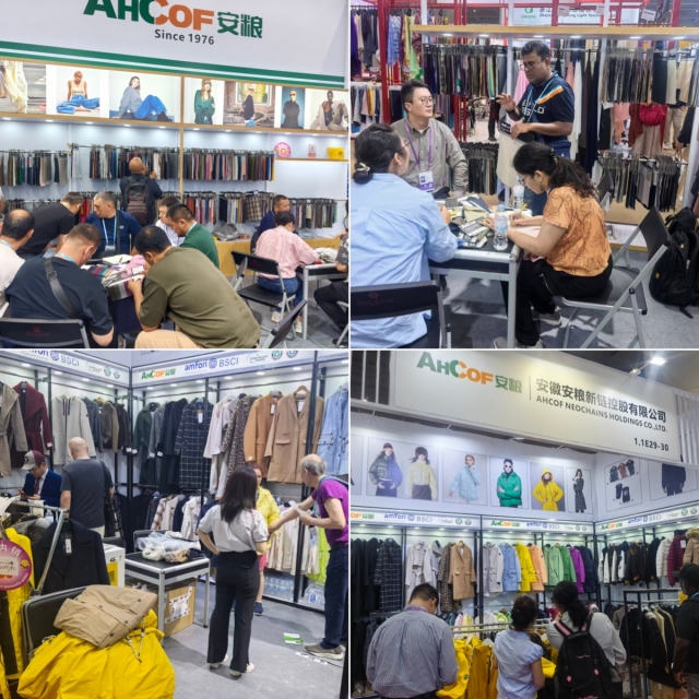 服裝展位則緊扣“綠色環保”與“工藝創新”兩大趨勢:棉服系列采用再生棉材質,精準契合全球低碳消費需求;PU雨衣類服裝應用高頻工藝,無需縫線即可實現平整外觀,兼顧視覺美感與實用性能。這一系列創新產品成功吸引來自法國、英國、比利時等歐洲中高端市場采購商重點關注,已有多組客戶明確表達合作意向。